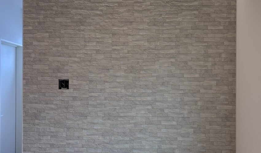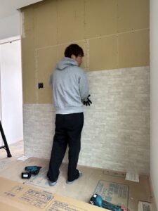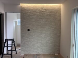 完成が近い家にテレビを付ける壁に大建の不燃性壁材を施工しました。